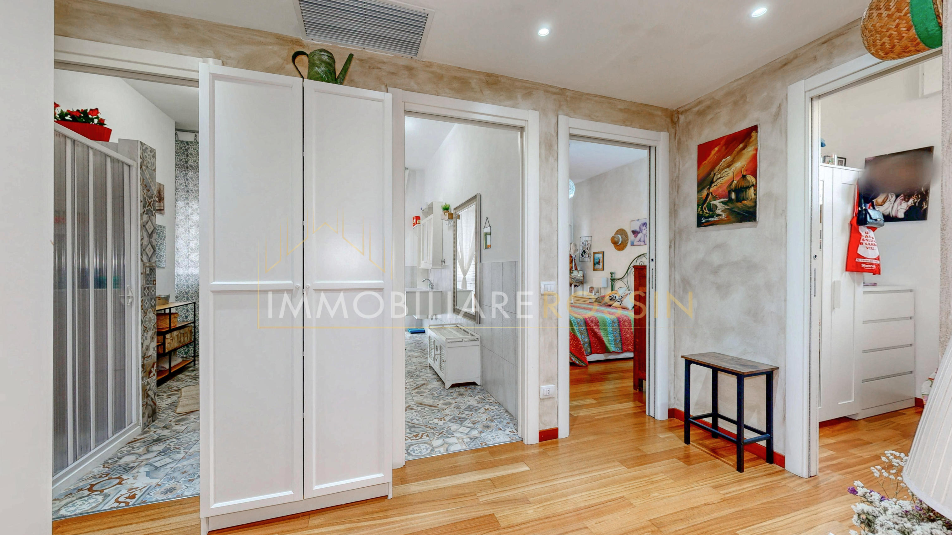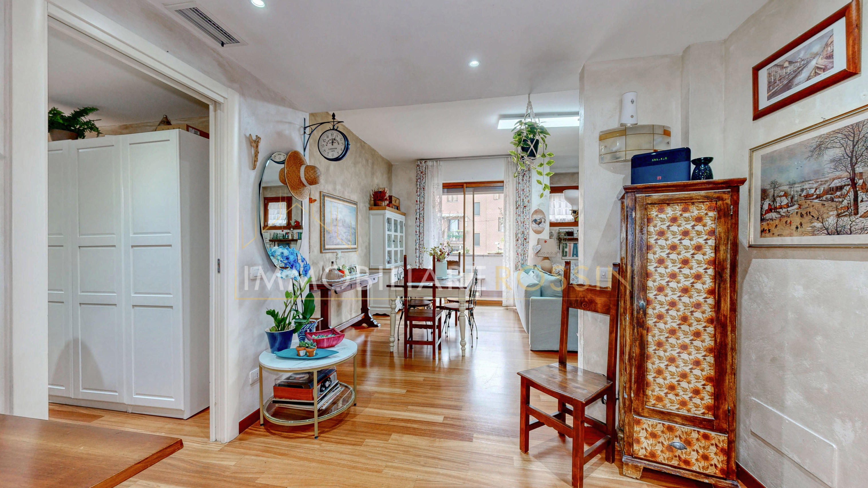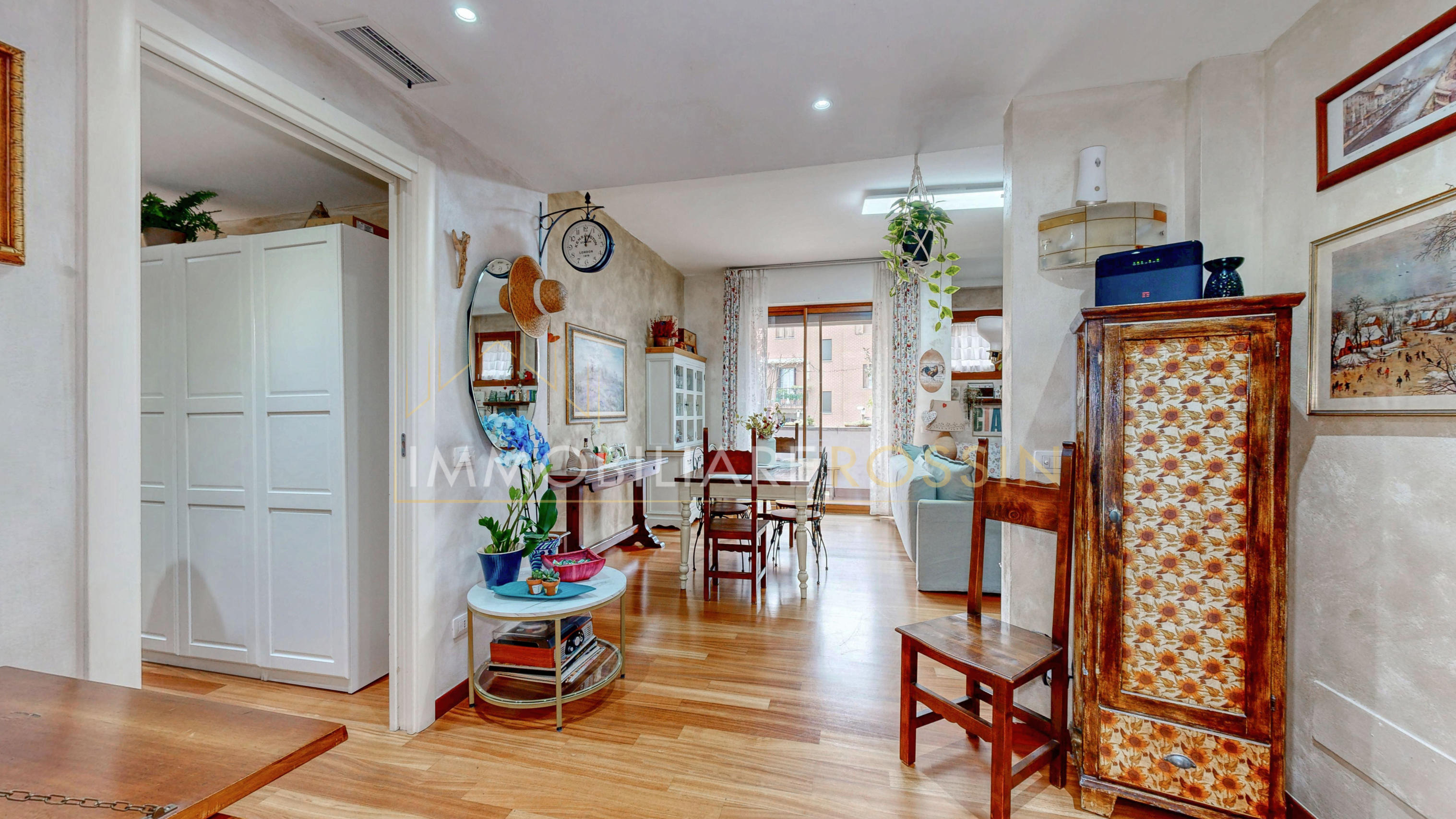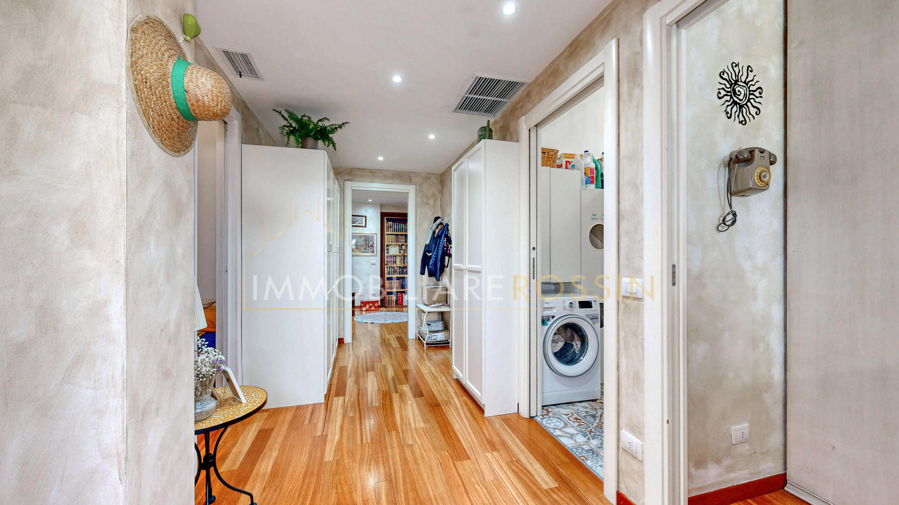 L'appartamento ha il parquet in tutti gli ambienti, cucina e bagni in grès porcellanato, infissi in PVC effetto legno con i doppi vetri, aria condizionata con pompa di calore canalizzata bizona e porte a scrigno in tutta la zona notte.